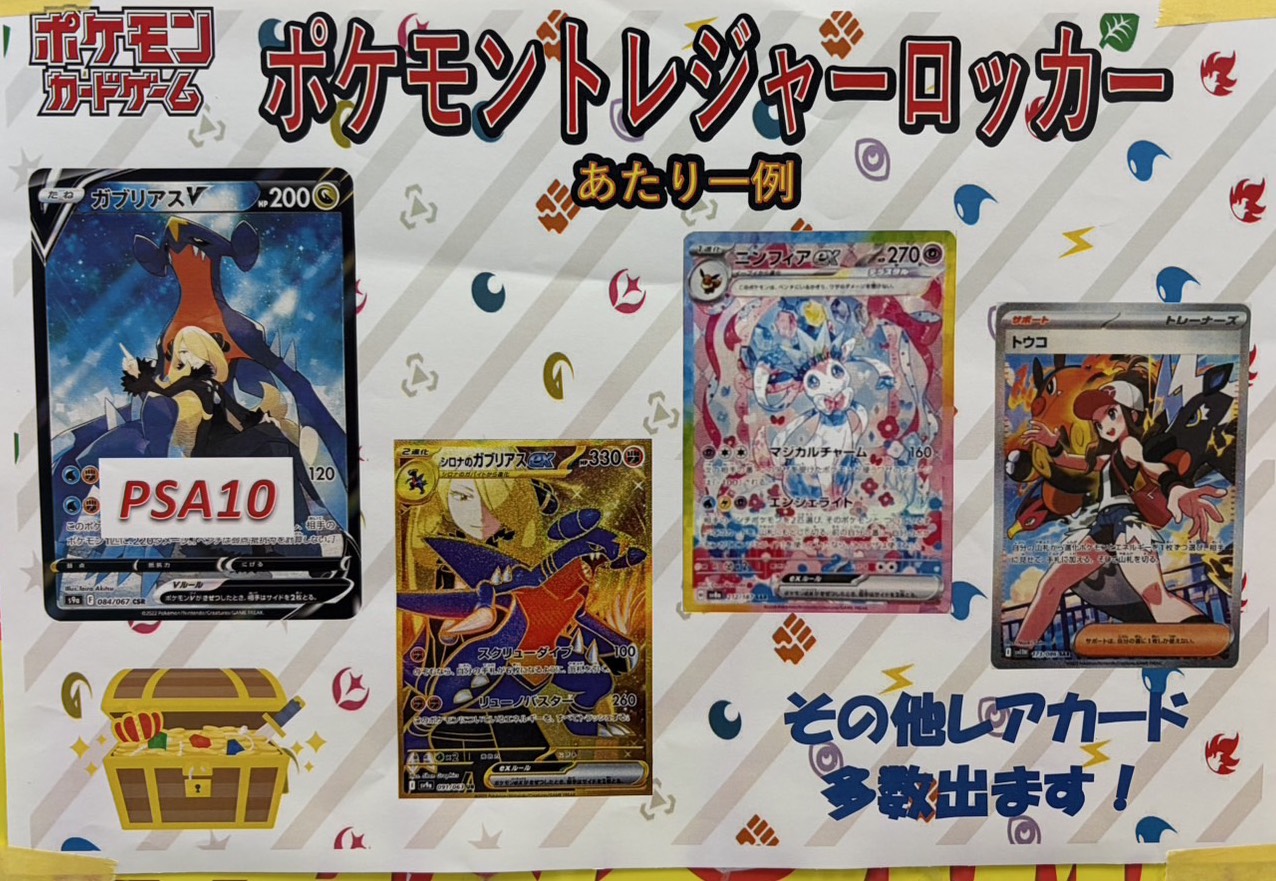 【佐世保3店佐々店】ポケモントレジャーロッカー更新しました✨ マンガ倉庫佐世保3店 マンガ倉庫佐々店 カード トレカ 2025年11月14日 佐々店 ポケモントレジャーロッカー更新しました✨ 今回の大当たりはPSA10のガブリアスVです💪🏽 他にもレアカード多数封入しております😊 ご来店をお待ちしております🙇♀️ 関連