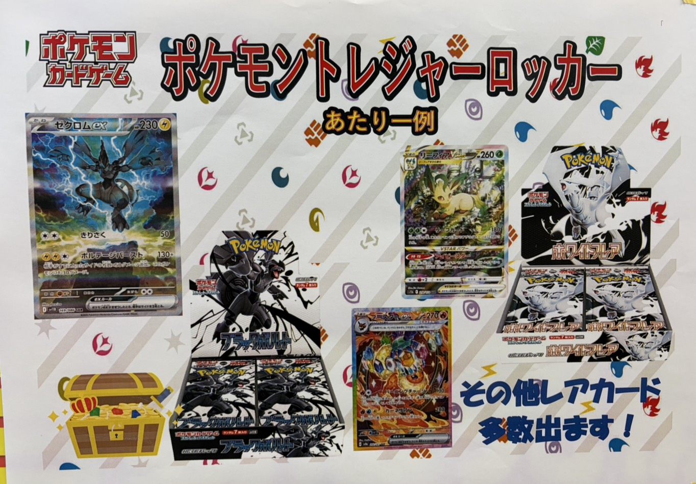 【佐世保3店佐々店】ポケモントレジャーロッカー更新しました✨ マンガ倉庫佐世保3店 マンガ倉庫佐々店 カード トレカ ガチャ 2025年11月15日 ポケモントレジャーロッカー更新しました✨ ブラックボルト&ホワイトフレアBOX ゼクロムex、リーフィアVstar、ブースターexなど他にもレアカード多数封入しております👑 皆様のご来店をお待ちしております🙇♀️🌈 関連