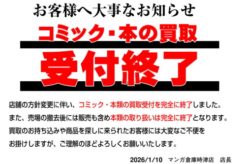 【時津店】本類取り扱い終了決定超セール!単品の本全品5冊200円!セットコミック全品50%OFF!!! new イベント情報 マンガ倉庫時津店 コミック/書籍 2026年1月11日 【本類取り扱い終了決定超セール】 単品の本全品5冊200円!セットコミック全品50%OFF!!! **************** こちら↓もぜひチェックしてみてくださいね♪(*´▽`*) ・最新のイベント情報はこちら ・最新の買取情報はこちら 関連