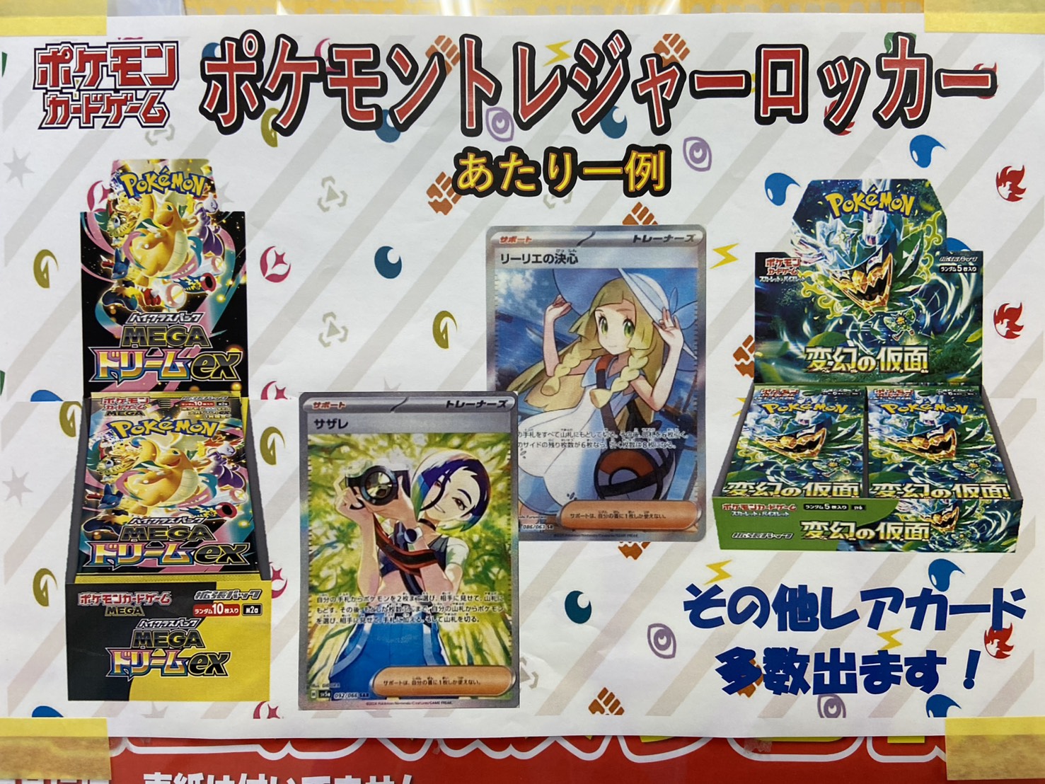 【佐世保2店 佐々店】ポケモントレジャー自販機更新しました! マンガ倉庫佐世保2店 マンガ倉庫佐々店 カード トレカ ガチャ 2026年3月7日 ポケモントレジャー自販機更新しました! 今回の当たりは リーリエのSRやサザレのSRなどその他豪華景品用意しております! 皆様のご来店お待ちしております✨ 関連