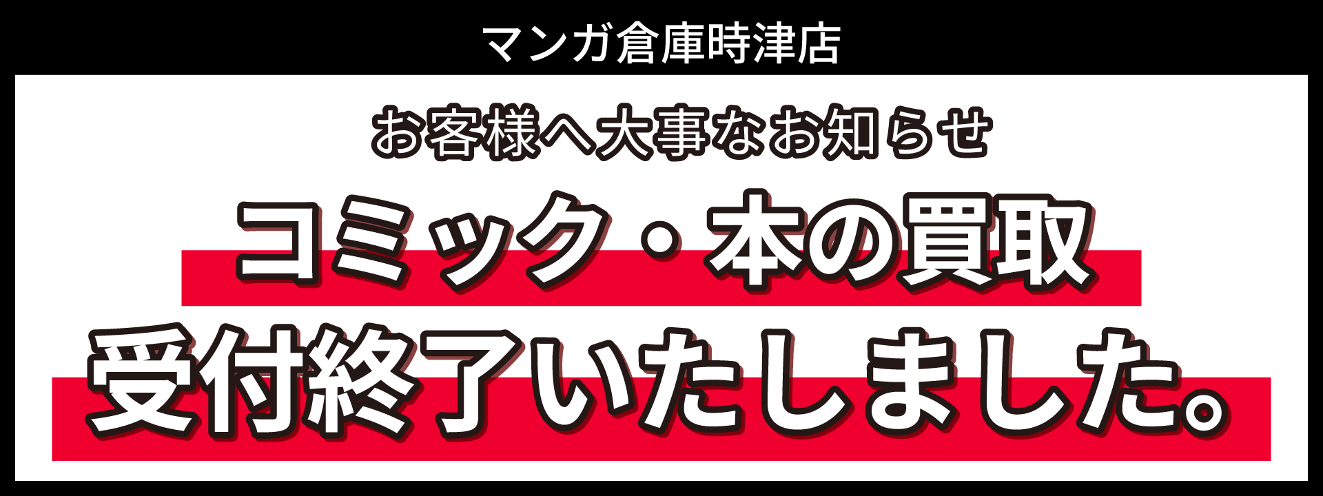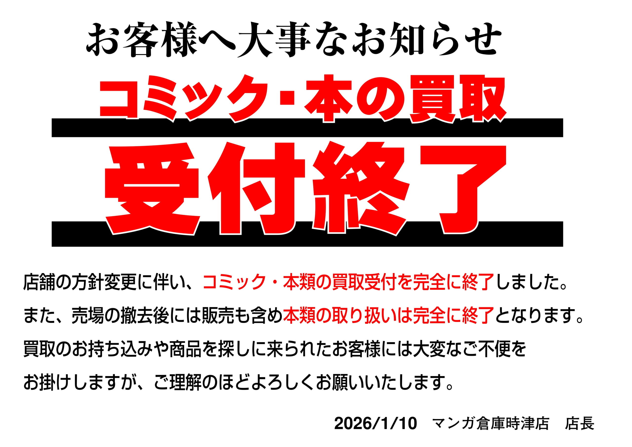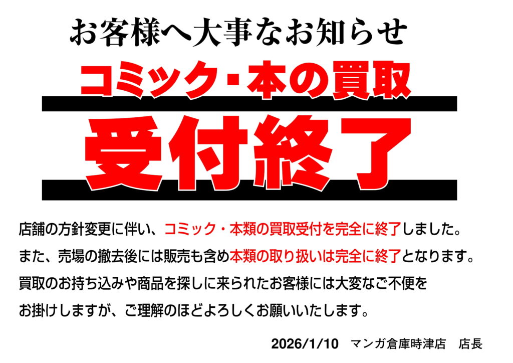 【時津店】コミック・本の買取受付終了のお...