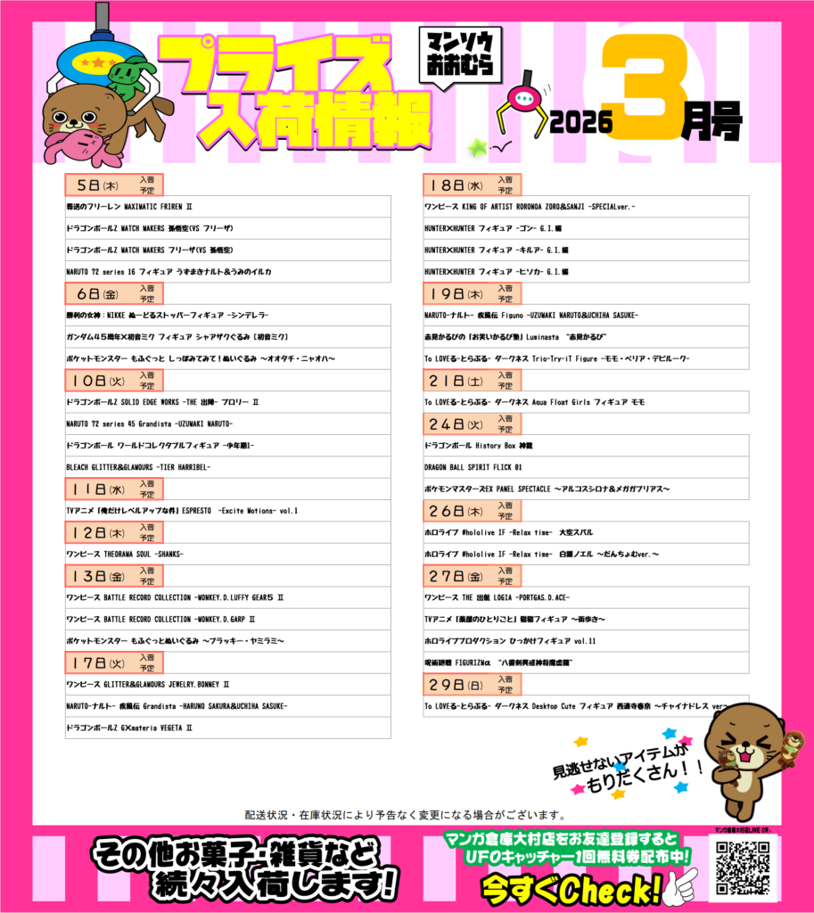 3月のプライズ入荷情報をお届けっ✩°。⋆⸜(* ॑꒳ ॑* )⸝ ぜひお迎えくだ…