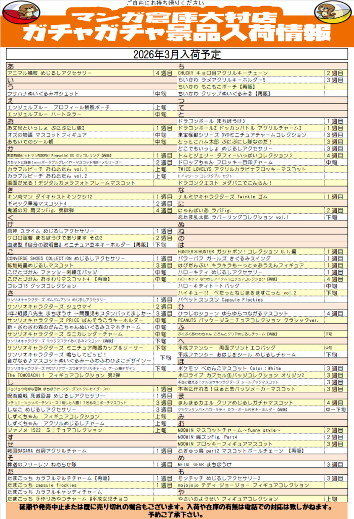 3月のガシャポン入荷情報をお届け〜(´。✪ω✪。`) 新作入荷情報につきまし…